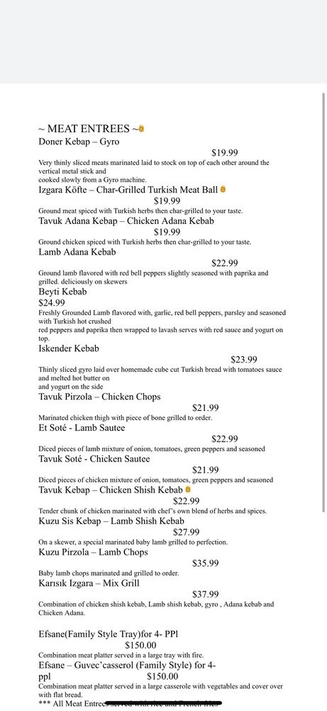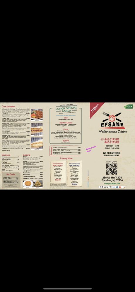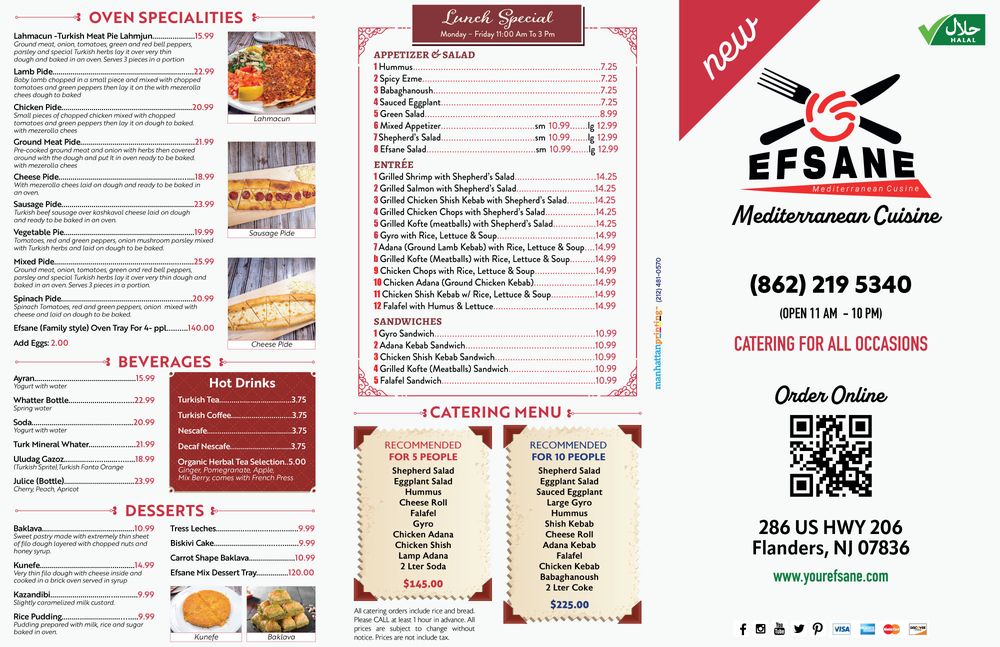 Welcome to Efsane Mediterranean Cuisine, an enchanting dining experience situated at 286 US-206 in Flanders, NJ. This Halal-certified restaurant offers a diverse array of authentic Mediterranean dishes that evoke the region's rich culinary traditions. Efsane stands out for its delicious and meticulously prepared offerings, from the Bamya Casserole featuring okra and fresh vegetables to the mouthwatering Lamb Shish served on homemade bread.